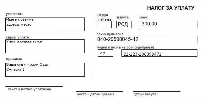 - доказ о уплати таксе за издавање података из казнене евиденције, у износу од 300,00 динара уплаћен на број рачуна 840-29598845-12, број модела 97, позив на број 22-223-106399471 (или судске таксене марке у наведеном износу)